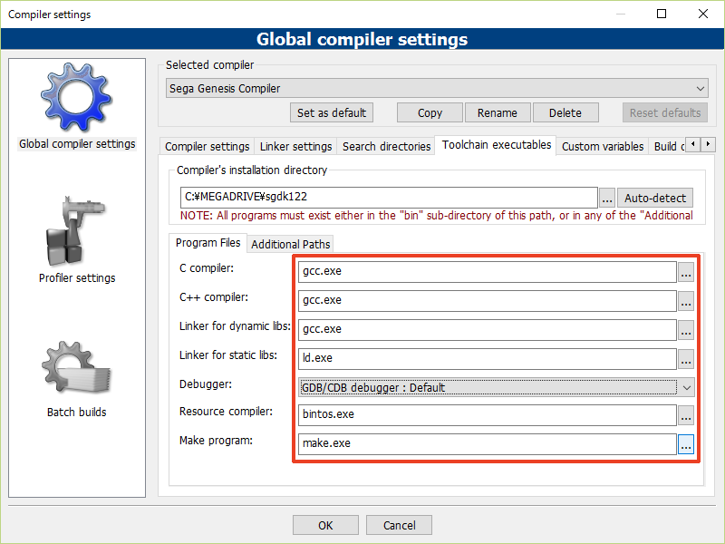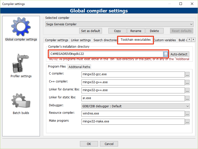 9. Toolchain executables의 탭으로 가서 Compiler's installation directory에 있는 '...' 버튼을 클릭하고 SGDK를 설치한 폴더를 선택합니다.