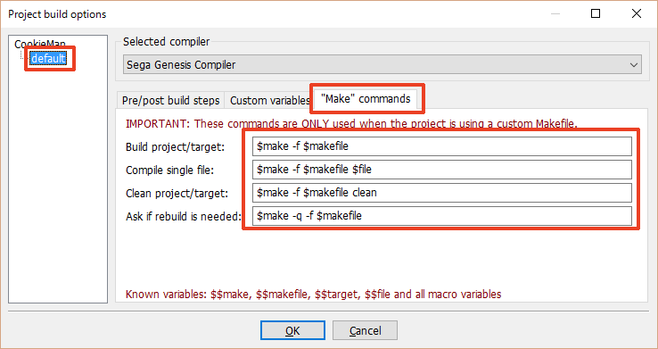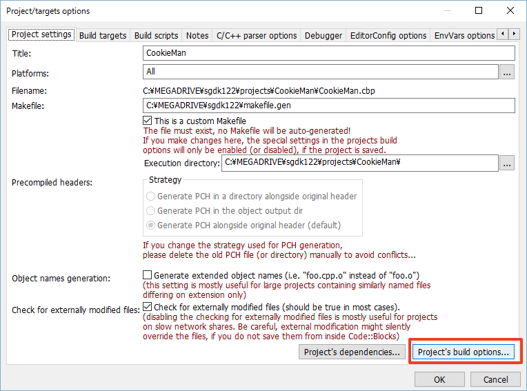 7. Makefile을 SGDK용의 커스텀 Makefile로 설정하고 OK를 클릭하여 윈도우를 닫습니다.