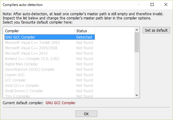 처음에 컴파일러를 고르는 화면이 나오므로, GNU GCC Compiler를 선택하고 OK를 클릭합니다.