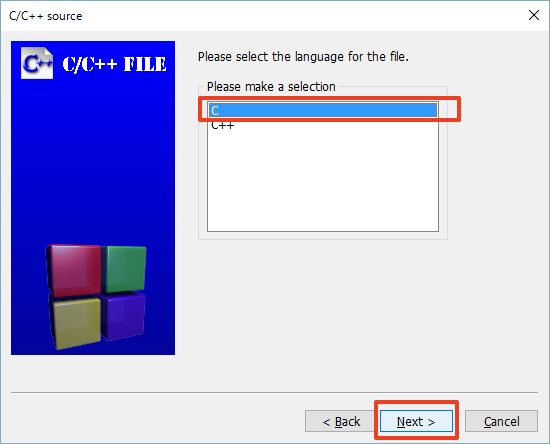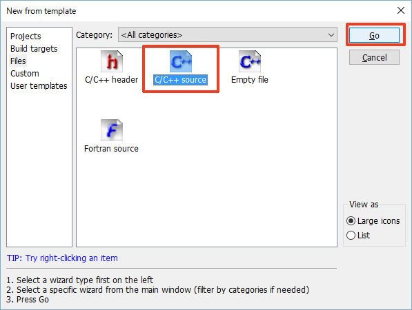 12. C/C++ source 를 선택하고 'Go'를 클릭