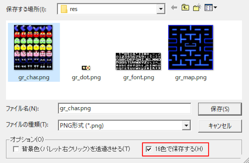 '16색으로 저장한다'를 체크하고, PNG 형식으로 저장합니다. 이 파일은 스프라이트로 사용할 예정입니다.