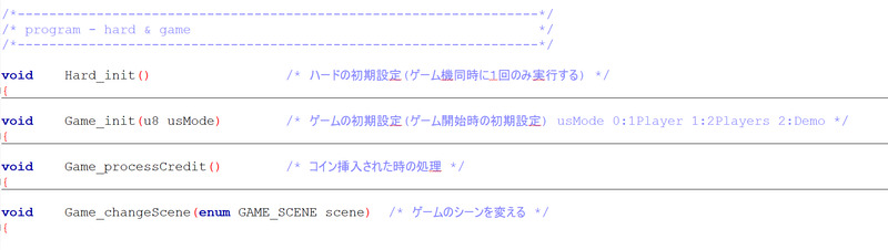Hard_int() 함수를 실행한 뒤, white 안에서 영구적으로 루프를 돌리는 것입니다만, 루프의 제일 마지막에 VDP_waitVSync()를 실행하는 것으로, 60분의 1초가 1사이클이 됩니다. 변수 game.state의 내용으로, 게임의 각 씬에 대응한 함수가 실행됩니다. 처리는 60분의 1초 이내에 행할 필요가 있어서, 그것을 조금이라도 오버하면 1사이클 늦게 처리 지연이 발생합니다.