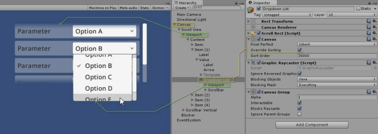 이 제한에서 예외는 오버라이드 정렬이 활성화된 중첩 캔버스입니다. 표준 Unity 마스킹 구성 요소의 효과는 오버라이드 정렬 세트가 있는 중첩 캔버스 간의 경계를 넘지 않습니다. 이는 예를 들어 표준 드롭다운 구성 요소에서 사용됩니다: 드롭다운 구성 요소는 별도의 캔버스에 드롭다운 목록을 생성합니다. 마스크된 영역 내에 드롭다운을 배치하면 예상대로 드롭다운 목록이 잘리지 않습니다. 소프트 마스크도 같은 방식으로 작동합니다: