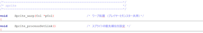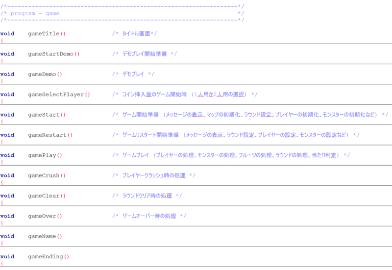 Hard_int() 함수를 실행한 뒤, white 안에서 영구적으로 루프를 돌리는 것입니다만, 루프의 제일 마지막에 VDP_waitVSync()를 실행하는 것으로, 60분의 1초가 1사이클이 됩니다. 변수 game.state의 내용으로, 게임의 각 씬에 대응한 함수가 실행됩니다. 처리는 60분의 1초 이내에 행할 필요가 있어서, 그것을 조금이라도 오버하면 1사이클 늦게 처리 지연이 발생합니다.