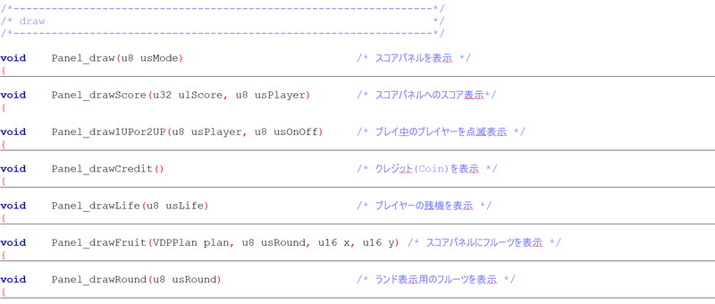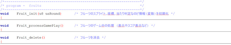 SGDK는 C++이 아니고 C언어이므로, 클래스는 사용할 수 없습니다. 하지만 클래스와 같은 구조를 상정하고, 함수를 Hard, Game, Round, Player, Enemy, Fruit, Panel, Sprite, Collision 과 같이 나누었습니다.