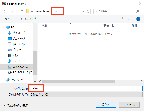 16. 파일명은 main.c로, 경로는 아까 만든 src 폴더를 지정합니다.