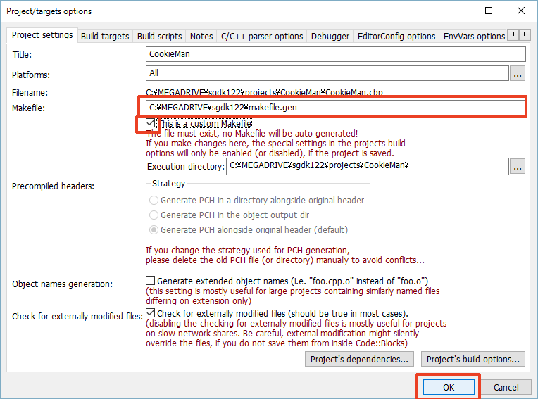 7. Makefile을 SGDK용의 커스텀 Makefile로 설정하고 OK를 클릭하여 윈도우를 닫습니다.