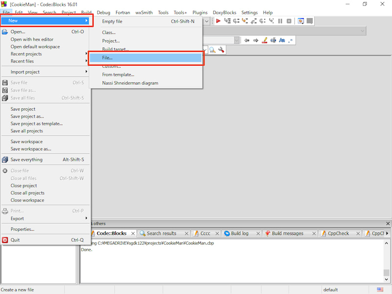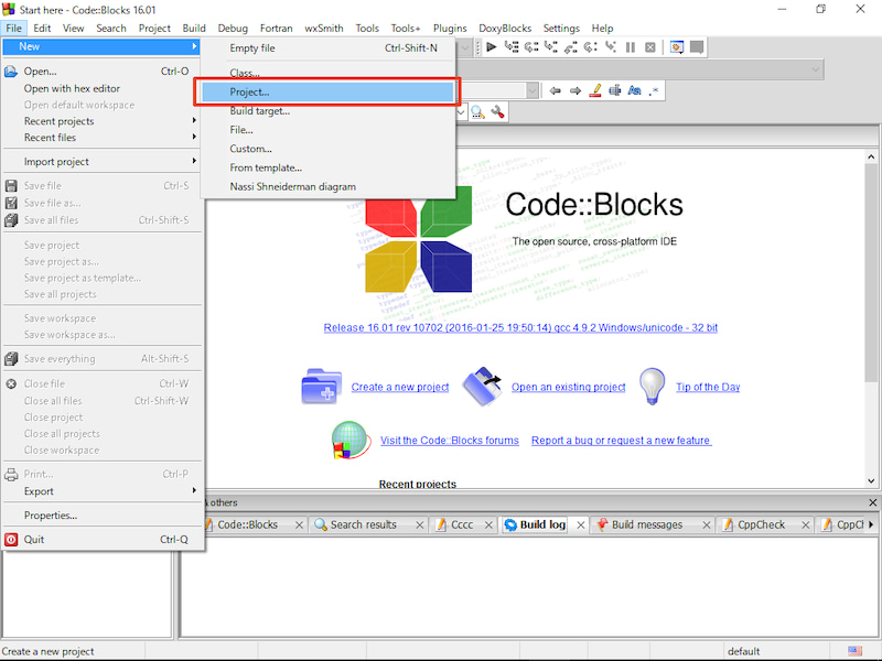 1. Code::Blocks의 메뉴에서 File > New > Project... 를 선택