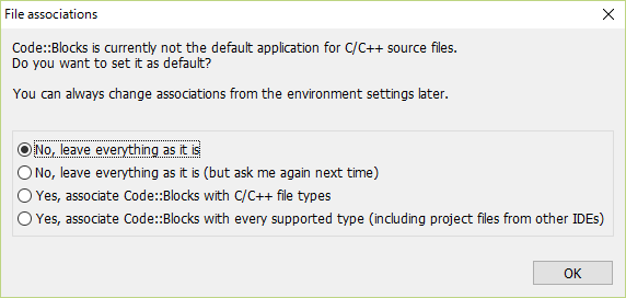 4. 다음으로 Code::Blocks의 확장자를 연결하는 과정이 있는데, 확장자 연결이 필요없다면 제일 위의 옵션을 선택합니다.