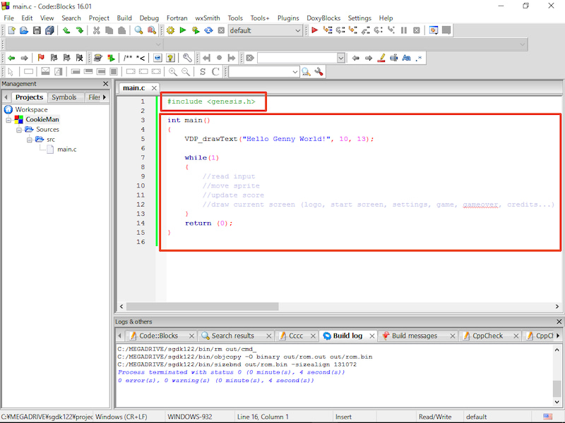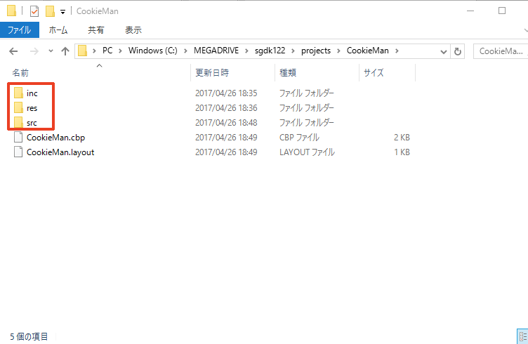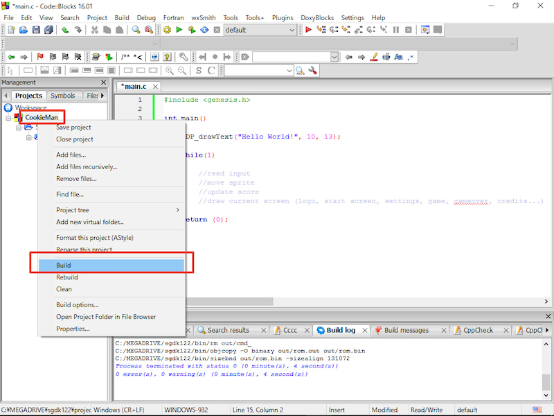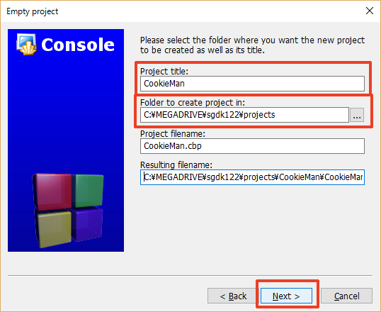 여기에서는 프로젝트 이름을 'CookieMan', 프로젝트 폴더를 'C:\MEGADRIVE\sgdk122\projects'로 했습니다.