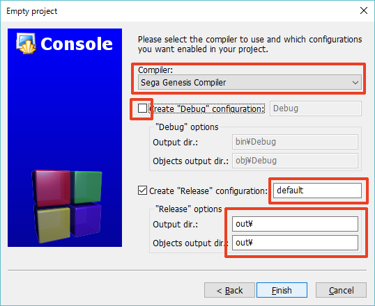 5. 아까 위에서 설정한 컴파일러 'Sega Genesis Compiler'를 선택하고, 아래와 같이 설정하고 'Finish'를 클릭하면 새 프로젝트가 만들어집니다.