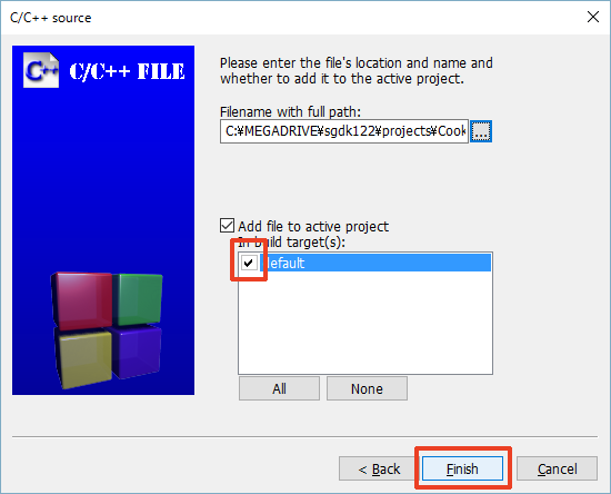 여기에서는 프로젝트 이름을 'CookieMan', 프로젝트 폴더를 'C:\MEGADRIVE\sgdk122\projects'로 했습니다.